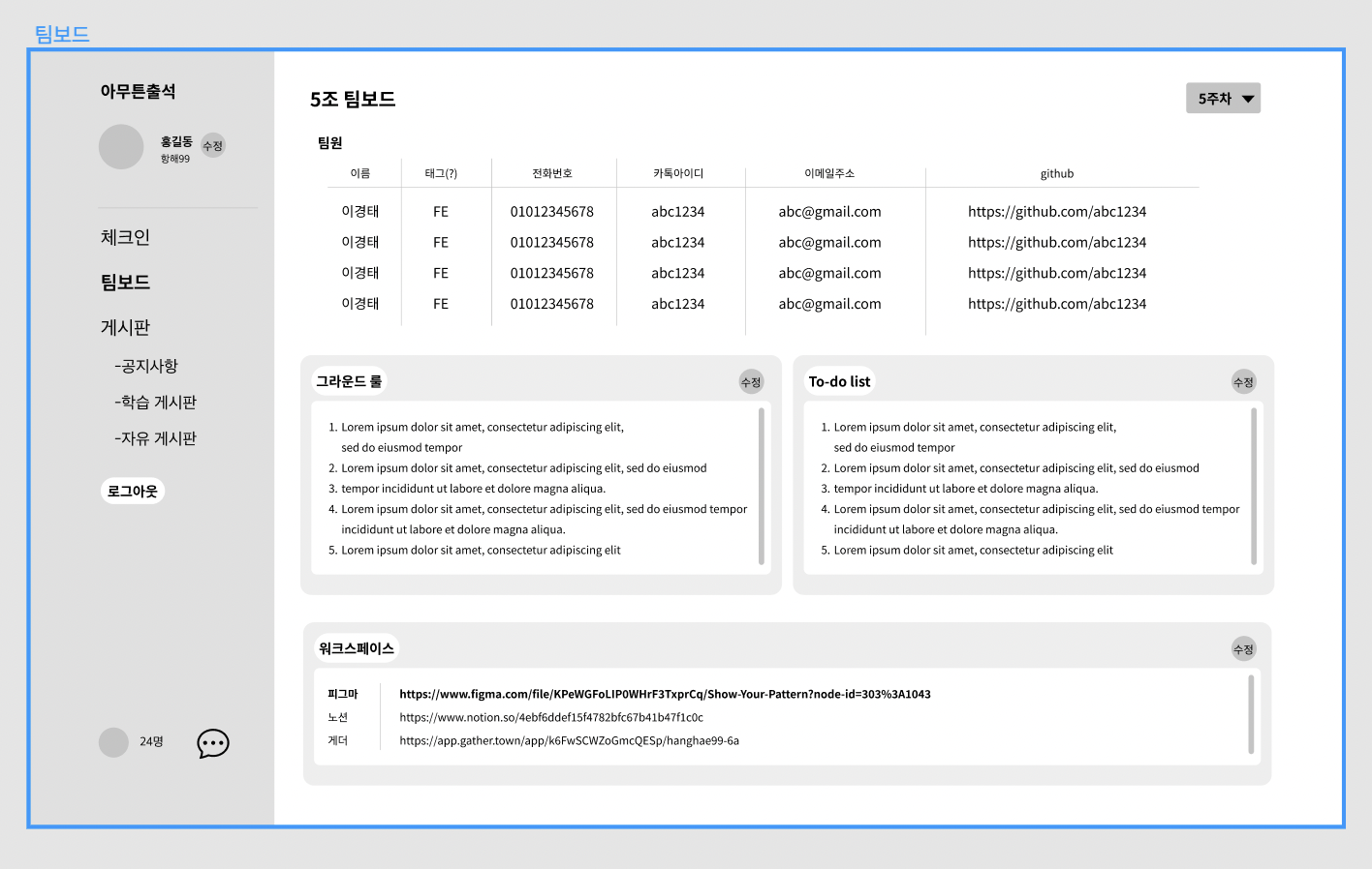 - 조별 대시보드(다른 조들도 볼 수 있는 진척도, 조별 체크리스트)