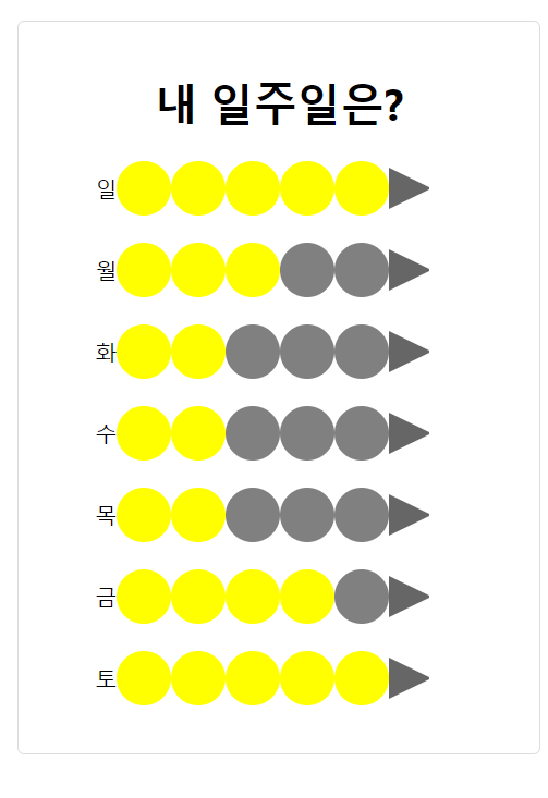 각 요일에 Math.floor(Math.random()*4+1) 을 사용해서 1부터 5까지의 정수를 받아 Maincycle 에 부모에서 자식으로 ( 프롭스값 ) 넘겨주고 랜덤한 수값에 따라 5개의 원들에 색을 바꾼다