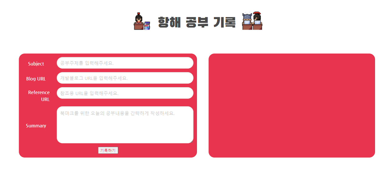 목표 , 블로그 , 참조 url , 메모등 입력후 기록하기 버튼을 누르면 입력값이 저장되서 화면에 보여집니다